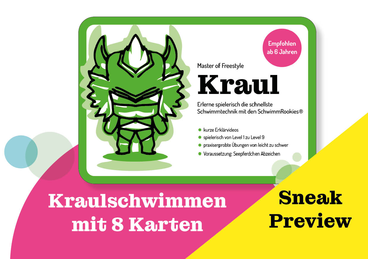 Überraschung! Als Sneak Preview zeigen wir das neue Kartenset „Kraulschwimmen lernen mit den SchwimmRookies®“. Es baut auf den Grundlagen auf und führt Kinder ab ca. 6 Jahren schrittweise in die Kraultechnik ein.